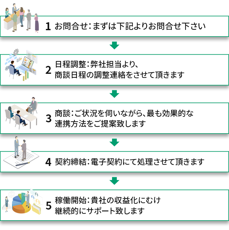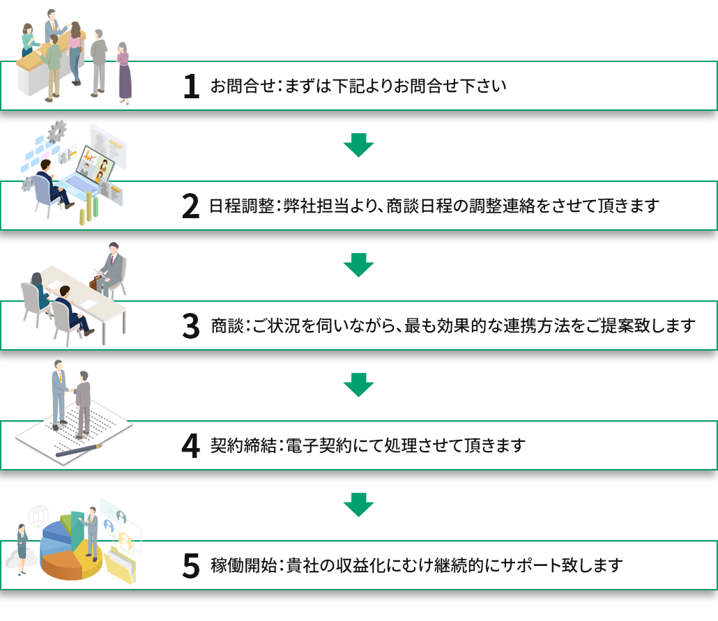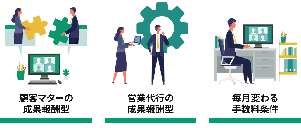 売上の一部をパートナー様に還元する仕組みです。パートナー様から紹介して頂く商材は、
